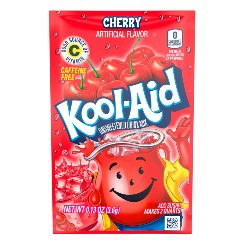 Kool-Aid Artificially Flavored Cherry Unsweetened Powdered Drink Mix is a delicious way to stay hydrated. This unsweetened powdered drink mix makes it easy to prepare a tasty Cherry drink. Just mix it with water and sugar or your sweetener of choice. Quench your thirst with the refreshingly sweet taste of Cherry. With no caffeine, this artificially flavored powdered drink mix is always a great choice for the whole family. These handy packets of unsweetened Cherry drink ensure that you always have a refreshing beverage ready-to-go. To prepare – empty contents drink mix packet into a plastic or glass pitcher, add 1 spoon of sugar or sweetener, then, just add ice and water and stir for a 2 quart supply of tasty Cherry Kool-Aid.