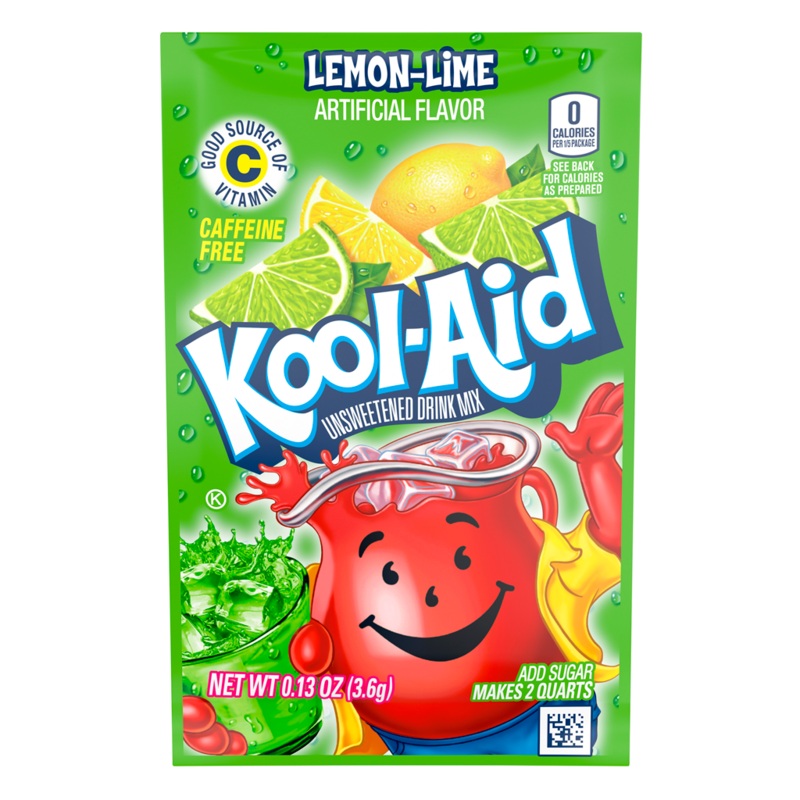 Kool-Aid Artificially Flavored Lemon Lime Unsweetened Powdered Drink Mix is a delicious way to stay hydrated. This unsweetened powdered drink mix makes it easy to prepare a tasty Lemon Lime drink. Just mix it with water and sugar or your sweetener of choice. Quench your thirst with the refreshingly sweet taste of Lemon Lime. With no caffeine, this artificially flavored powdered drink mix is always a great choice for the whole family. These handy packets of unsweetened Lemon Lime drink ensure that you always have a refreshing beverage ready-to-go. To prepare – empty contents drink mix packet into a plastic or glass pitcher, add 1 spoon of sugar or sweetener, then, just add ice and water and stir for a 2 quart supply of tasty Lemon Lime Kool-Aid.