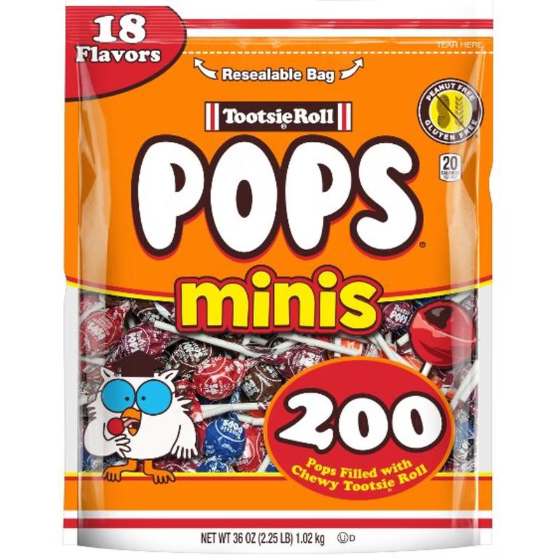 Bag contains 200 Tootsie Pops Miniatures with 18 mouthwatering flavors: