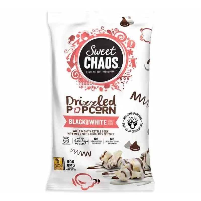 Sweet Chaos Drizzled Popcorn - Black and White is the ultimate gluten-free, non-GMO snack! This perfectly popped sweet & salty kettle corn is elevated with a rich, chocolaty double drizzle, making every bite deliciously crunchy, irresistibly sweet, and per